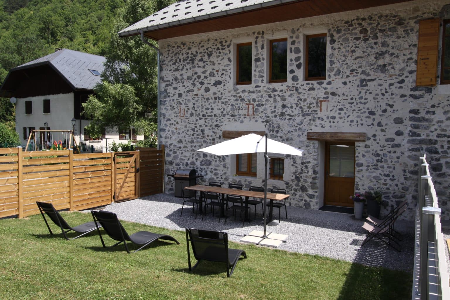 A l’extérieur un jardin/terrasse clos exposé sud avec barbecue, salon de jardin, parasol, transats et chaises longues et une autre terrasse ombragées vous attendent.